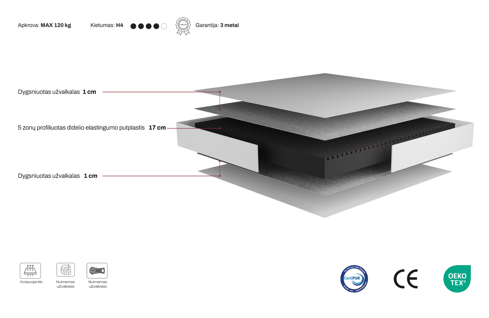 Čiužinys LIRA – 19 cm aukščio putų čiužinys, sukurtas ieškantiems patikimo sprendimo kasdieniam poilsiui. Jo didelio elastingumo profiliuota Comfort Foam užpildo struktūra tolygiai paskirsto kūno svorį ir spaudimą, todėl užtikrina stabilų atramos pojūtį bei ramų miegą. Vidutinio+ kietumo (4/5) pagrindas leidžia išlaikyti balansą tarp komforto ir tvirtumo, o nuimamas, skalbiamas megztas užvalkalas padeda išlaikyti švarą bei higieną namuose.