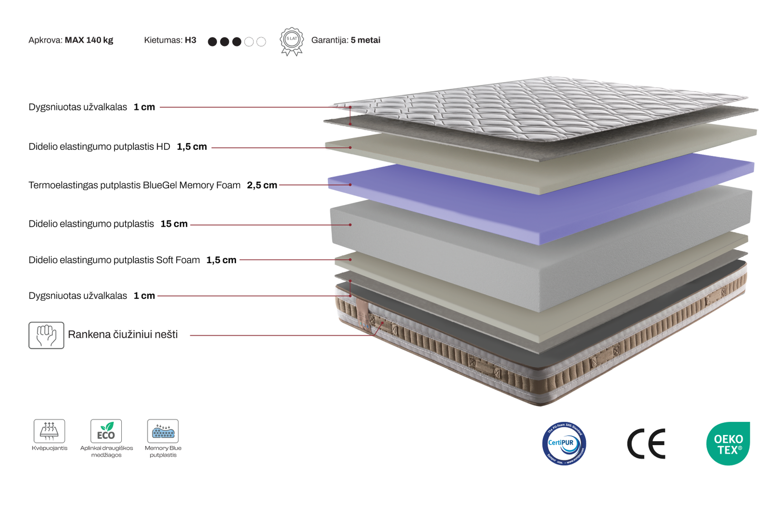 Svarbu: čiužinys yra dvipusis – viena pusė gali būti šiek tiek minkštesnė, kita – vidutinio kietumo; tai leidžia pasirinkti variantą pagal asmeninį komfortą arba keisti priklausomai nuo metų laiko. Maksimali apkrova – iki 140 kg, todėl SIENA tinka tiek vienam žmogui, tiek porai su vidutiniu svoriu.