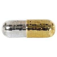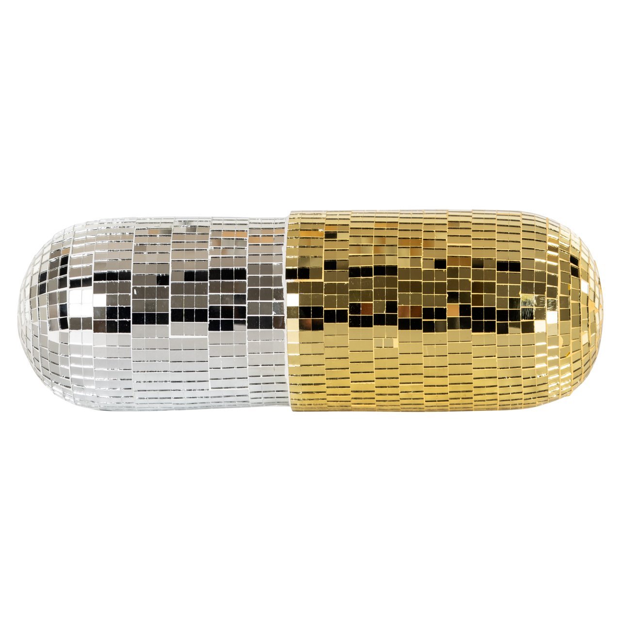 The Jimmy is a striking decorative object that immediately grabs attention with its unique design and sparkling finish. This decorative pill is executed in a combination of gold and silver, covered with a mosaic of mirror tiles that beautifully reflect light and create a glamorous atmosphere in any space. The Jimmy adds a playful and contemporary twist to your interior, perfect for those who love bold and unconventional design pieces. This decorative object is ideal for placement on a side table, bookshelf, or sideboard, where it makes a daring and stylish statement.