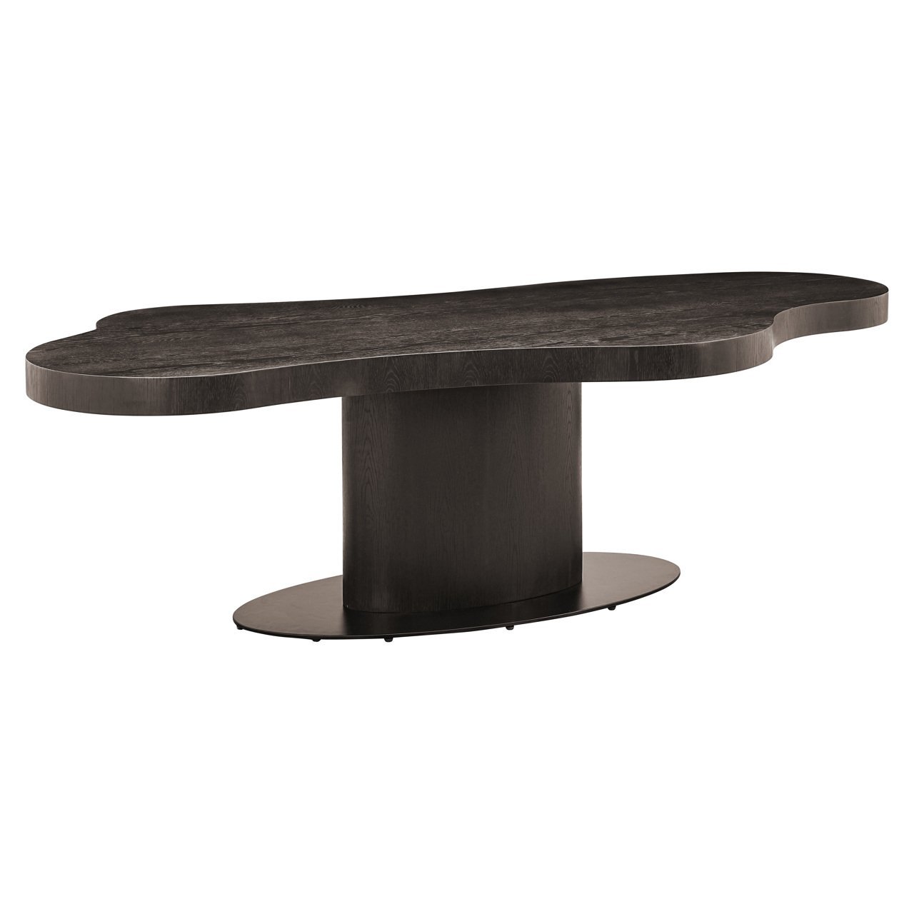 The Bogor dining table is made of oak veneer and plywood, ensuring a sturdy and durable construction. The table features an organically shaped top that gives a unique and modern appearance to your dining space. Available in sizes 225 cm and 260 cm, this table offers ample space for dining and gatherings. The dark finish of the oak veneer emphasizes the natural wood grain and adds a stylish, contemporary ambiance to any interior.