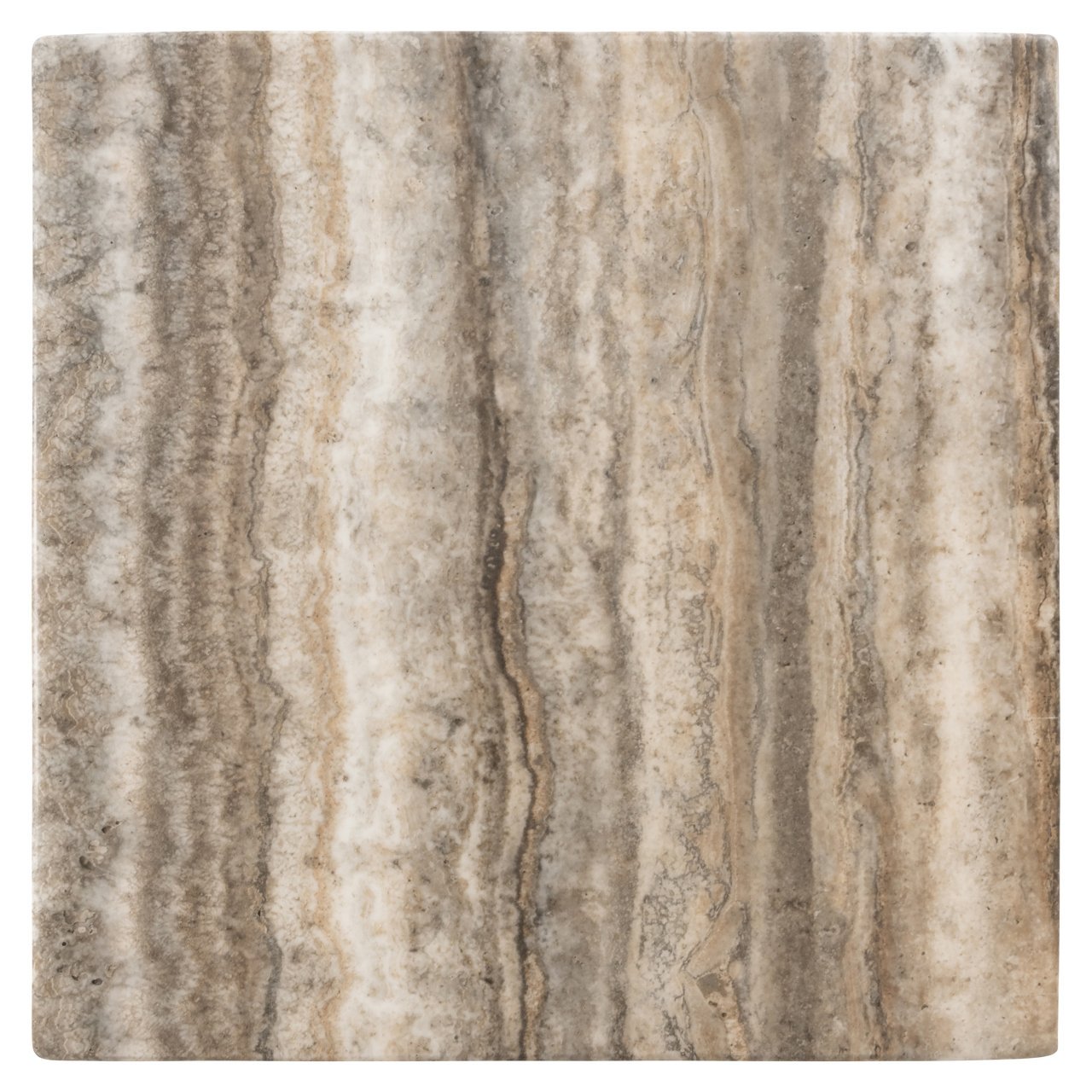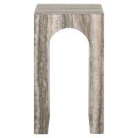 End table Dulce has a sculptural column shape with a grey faux travertine finish. A compact accent piece with timeless character.