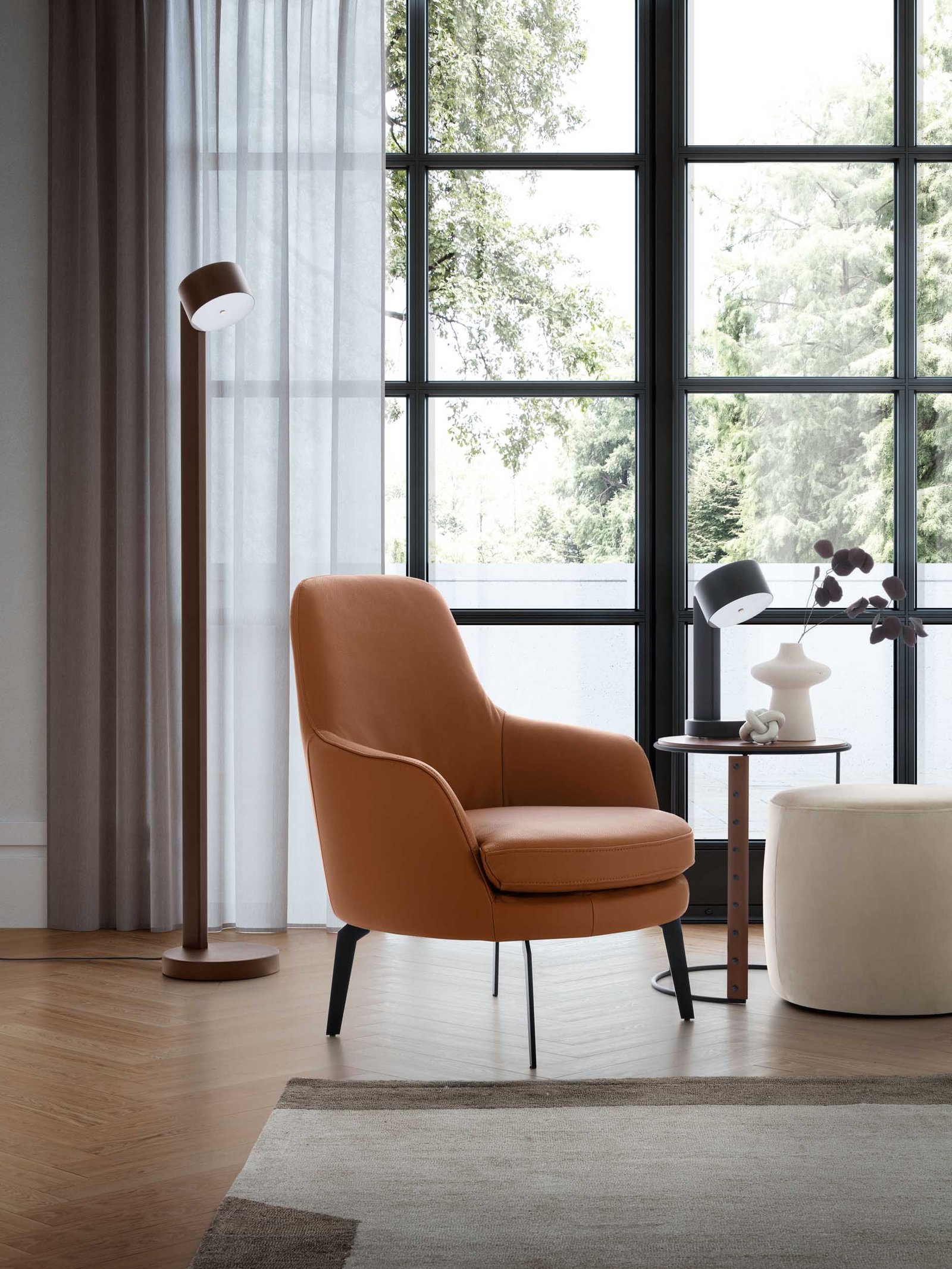 Fotelio kojelės primena šiuolaikinių lėktuvų sparnų formą – elegantiškai ilgos, vizualiai praplečiančios interjerą. Kartu jos tarsi „pakelia“ fotelį virš žemės, suteikdamos jam lengvumo, o erdvė atrodo dar platesnė. Didelė, minkšta sėdimoji dalis sukuria jaukią „debesies“ iliuziją, kuri tarsi kviečia atsipalaiduoti.