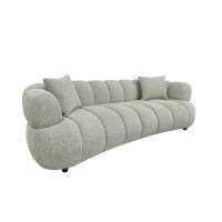 Sofa Amelia features fixed cushions, a soft, rounded design and comes with two decorative pillows. Upholstered in natural fancy. Also available in lodge blossom.