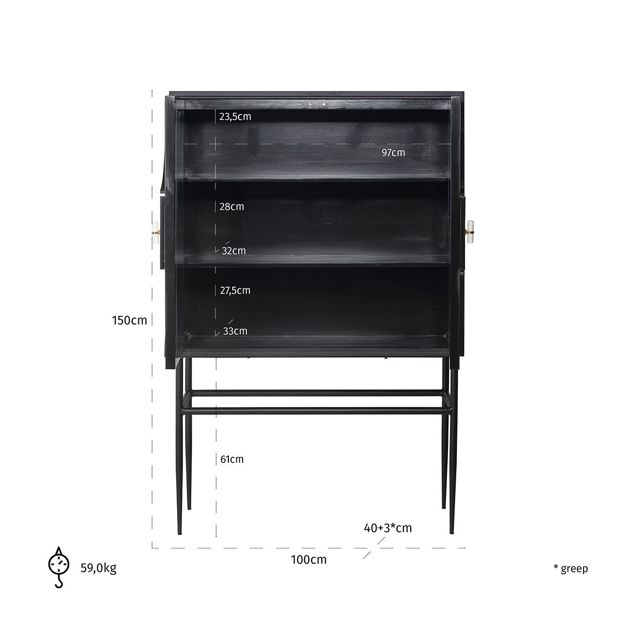 Komodos išmatavimai: aukštis – 150 cm; gylis – 40 cm; ilgis – 100 cm