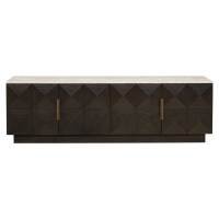 The Claremont TV cabinet is made from oak veneer, oak wood, travertine, and wood, offering a robust and elegant appearance. The sideboard has four doors with a geometric pattern, giving the piece a modern and striking look. The stone top provides a solid surface that is both functional and stylish. This sideboard offers generous storage and is a perfect blend of design and functionality for your living room.