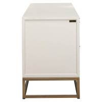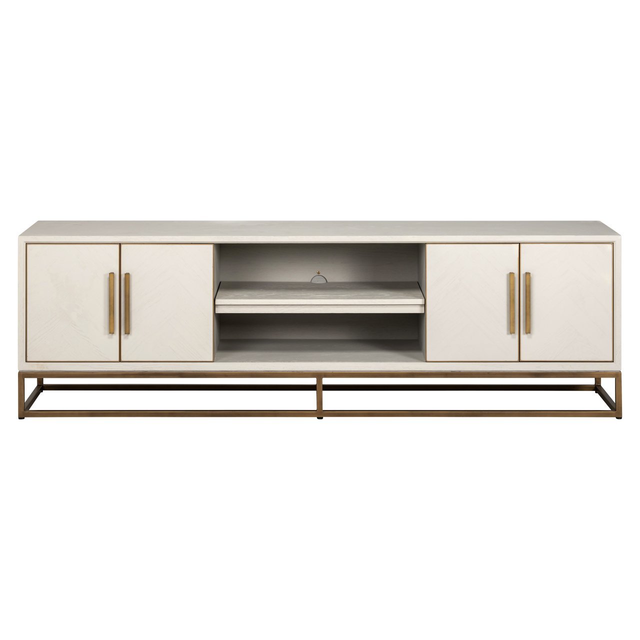 A combination of Oak Veneer and copper-colored metal comes together in this stylish TV cabinet from the Whitebone Brass collection. The whitebone finish of the Oak Veneer, combined with copper-colored metal accents, creates a luxurious look. With four doors and a width of 200 cm, this piece of furniture provides ample storage space for all your entertainment needs.